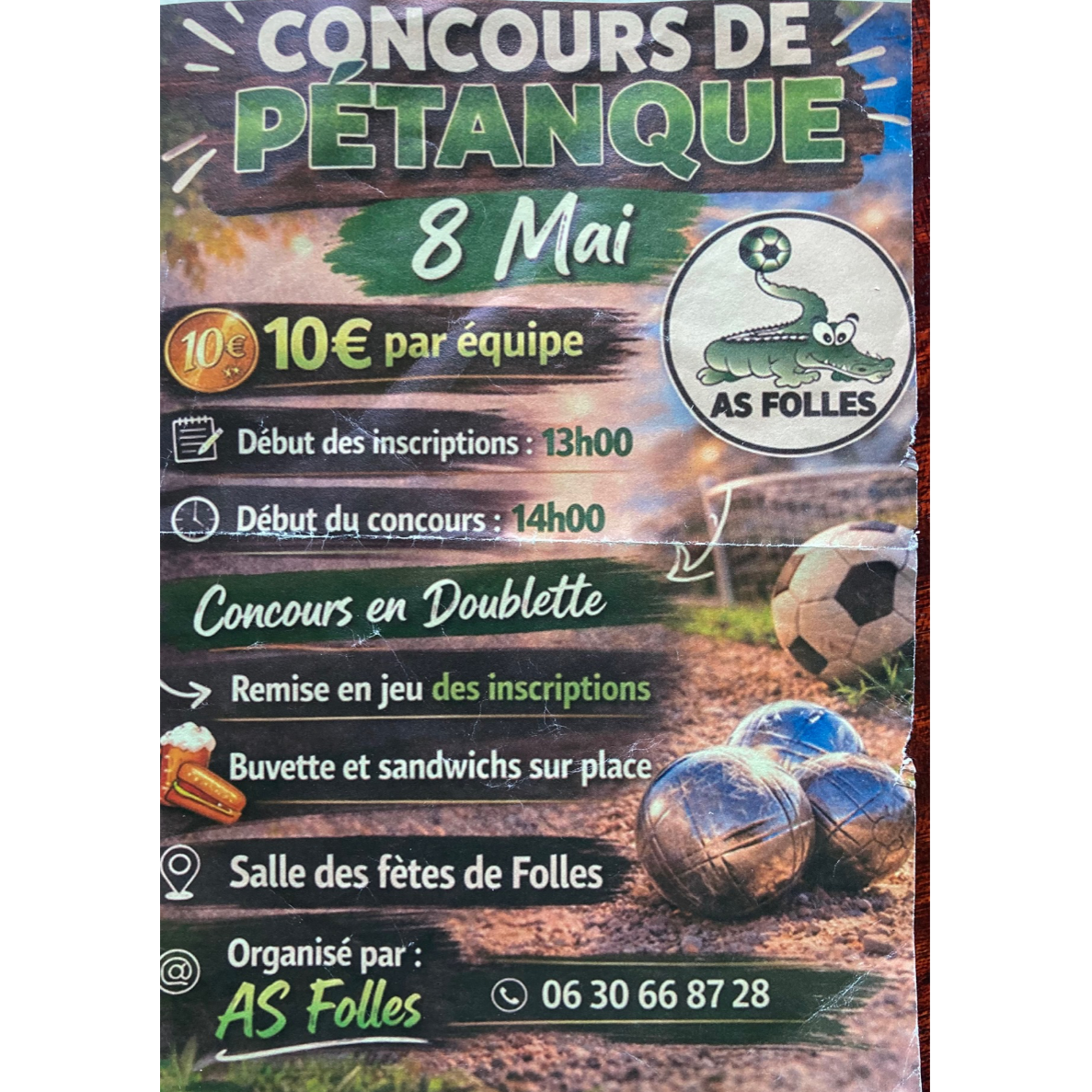 Un concours de pétanque en doublettes se tiendra le vendredi 8 mai à la Salle des Fêtes de Folles.